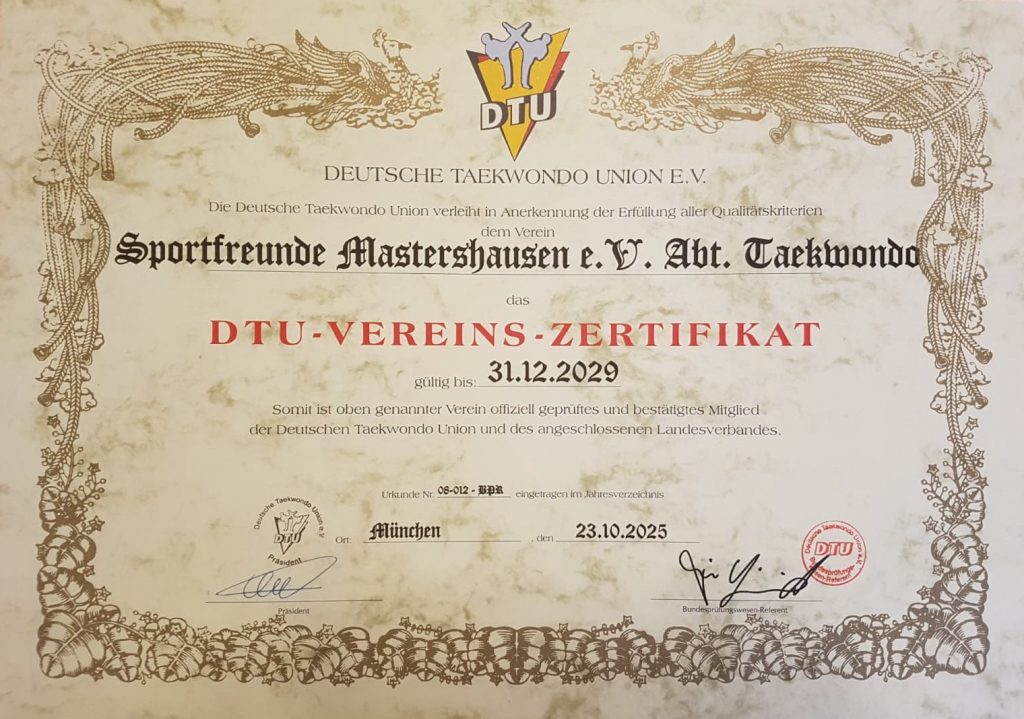 Die Deutsche Taekwondo Union, der einzige in Deutschland anerkannte Fachsportverband für olympisches Taekwondo, hat die Abteilung Taekwondo der Sportfreunde Mastershausen mit dem DTU-Vereinszertifikat ausgezeichnet.